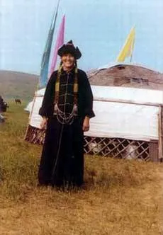 - 衣著方面,男女都穿繡花高領的上衣。男子穿長袍,或白色短褂,外套黑色或紫紅色坎肩,下穿長褲,冬季外套無領斜襟光板皮襖,繫腰帶,腳穿長靴。婦女穿斜襟上衣,兩袖以紅、藍、黃、紫、黑五色布圈做成。外套黑色坎肩,下穿裙、褲。頭戴平頂氈帽,帽檐上鑲有花邊。